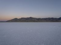 a lake with no water, in a mountainous plain at dusk with small mounds and mountains behind
