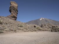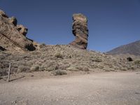 This is an image of a scenic road in Tenerife, Spain. The landscape features a desert-like terrain with sand, dirt, and rocks. In the distance, majestic mountains rise against the clear sky. The open space and natural environment make this a perfect destination for off-road adventures and exploring the wilderness. The rocky outcrops and gravel surfaces showcase the geology of this area, including volcanic formations and the presence of batholiths. This photo captures the beauty and serenity of Tenerife, a popular destination in Europe for nature enthusiasts and outdoor activities.