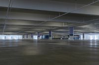 an empty parking garage with some signs hanging off the ceiling of it's sides