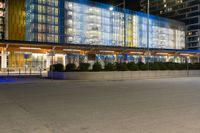 A modern open space building in Toronto, Canada. The building is illuminated at night, with numerous windows on each side. A striking architectural marvel in the heart of Toronto's cityscape.
