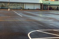 this is an empty parking lot near a parking lot in a city center, with no sidewalks and shops