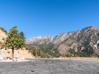 An open space in the United States, with a clear sky and a majestic mountain range in the background. A deserted street with a dirt and gravel surface exemplifies the tranquility of the day.