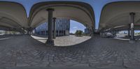 Berlin open space showcasing urban design and modern architecture under a clear sky. Cobblestone streets cast hard shadows against the surface. A glimpse of European city life in Germany.