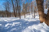 This photo captures a scenic winter day in rural Ontario, Canada. The clear sky creates a beautiful backdrop for the snow-covered trees and open space. A road travels through the forest, creating a snow trail. This image depicts the serene and peaceful atmosphere of the Canadian countryside during the winter season. The thick sheet of snow gives the landscape a pristine and untouched look. Explore the beauty of rural Ontario with this stunning photo.
