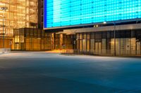 A view of an empty parking lot in Toronto, Canada. The night sky is lit up with a brilliant blue color, highlighting a very tall building. An open space in the heart of the city.