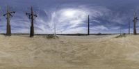 Open expanse in Mojave Desert, California with clear skies and industrial landscapes. Visible are electric windmills and dirt surfaces, portraying a typical day in the USA's industrial region.