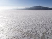 A breathtaking view of the rugged desert landscape in Utah, USA. The clear sky and calm sea accentuate the serene beauty of the open space. Salt Lake City sits in the horizon, surrounded by mountains and the iconic Salt Lake.