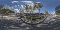 A 360-degree view of a modern business center in Ottawa, Canada. The empty road outside is lined with buildings, trees, and street lights. The clear sky contrasts with the grey architecture. A snapshot of city life in Ottawa.