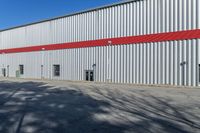 A factory building in Ottawa, Canada, with a clear sky and hard shadows cast on the road surface. The composite material facade and wooden siding provide a striking contrast. A typical day in Canada's capital.