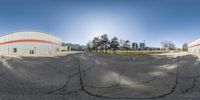 Panoramic view of a vacant parking lot and surrounding structures in Ottawa, Canada. Clear sky casts hard shadows on the grey asphalt. The architecture and real estate provide a composite of patterns and lines.