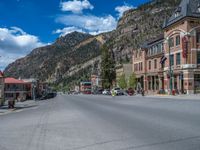 A scenic road in Ouray, Colorado, surrounded by mountains and a clear, blue sky. Quaint suburban village with charming storefronts. Perfect for a day of shopping and exploring.