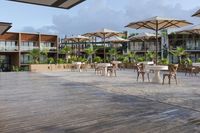 This stock photo features an outdoor bar and restaurant located in the beautiful city of Solidaridad, Mexico. The modern architecture of the building blends seamlessly with the surrounding residential area. The bar is surrounded by tables with umbrellas and other outdoor seating, providing a perfect spot for leisure and vacation. The clear sky and the shade of the trees create a pleasant atmosphere, inviting visitors to relax and enjoy the day. The wood flooring adds a touch of warmth and elegance to the outdoor space. Whether you're a tourist or a local, this bar and restaurant in Solidaridad is a must-visit destination for a great dining experience.