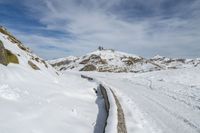This is an image of a snowy mountain slope in Europe. The highland terrain is covered with a thick layer of snow, creating a beautiful landscape. The curve of the road adds to the scenic view. The clear day sky contrasts with the clouds lingering over the mountain peaks. This photo captures the beauty of nature in Italy, with its snowy surfaces and stunning outdoor recreation opportunities. It represents a freezing winter day in the European highlands.