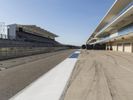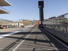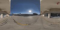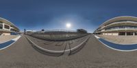 A fisheye lens view of a modern oval building surrounded by cars on the street. The architecture of the building is unique and stands out in the cityscape. A bustling urban scene on a clear winter day.