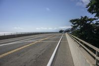 a paved highway along the coast with a bridge and two lanes of asphalt, with a large tree beside it