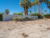 A sunny day in Palm Springs, California, showcasing the unique mid-century architecture. A gravel road cuts through the desert wasteland, lined with palm trees, bushes, and sparse grass. Clear skies enhance the low-slung residential buildings.