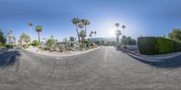 A sunny day in Palm Springs, California. Straight down the road, lined with palm trees, leads to a modern suburban home. The low profile house is surrounded by a concrete parking lot and a clear sky.