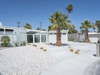 This is an image of a modern residential building in Palm Springs, California, USA. The architecture features a sleek design with clean lines and a flat roof. The surrounding area is filled with palm trees and well-manicured gardens. The clear sky and the Sonora Desert in the background create a serene atmosphere. This photo represents the unique blend of modern architecture and natural beauty that Palm Springs is known for.