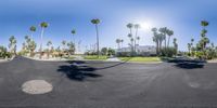 a photo looking down at an empty street that has palm trees and shrubs lining both sides