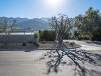 A sunny day in Palm Springs, California showcasing modern residential architecture. The clear sky highlights the mid-century style homes surrounded by palm trees. The road leads through the suburban villa neighborhood in the Sonora Desert.