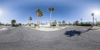 A straight road lined with palm trees leads to a modern residential neighborhood in Palm Springs, California. Low-profile homes with mid-century architecture are surrounded by the Sonora Desert. Clear skies and a fish-eye lens capture the vibrant atmosphere.