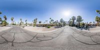 multiple panoramic images of a street with palm trees in the background and buildings