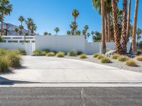 A view of a modern residential home in Palm Springs, California. The straight road leading to the house is lined with palm trees. The house features mid-century architecture and is surrounded by the Sonora Desert.
