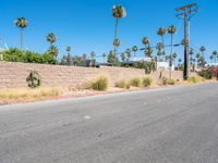 a paved street with a brick wall, and palm trees behind it and a fire hydrant beside it