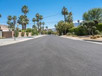 This is an image of a straight road in Palm Springs, California. The low, modern architecture of the residential houses can be seen on both sides of the road. The asphalt road stretches endlessly through the suburban neighborhood, surrounded by palm trees and the clear sky. The image captures the essence of the mid-century modern aesthetic that Palm Springs is known for. With the Sonora Desert in the background, this photo represents a typical day in Palm Springs, showcasing the unique architecture and endless roads of this iconic city.