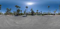 A view of palm trees in Palm Springs, California, with a clear sky above. The trees line the open parking lot, providing a modern suburban backdrop. A parked car and a low concrete building can be seen in the distance.