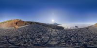 a panorama camera of a mountain side trail with sun shining above it and snow capped peaks