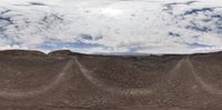 A breathtaking panoramic view of cloud-covered sky over the majestic mountain tops in the desert. The landscape reveals a road surface winding through the terrain, surrounded by lush vegetation and open spaces. A serene and peaceful natural environment.
