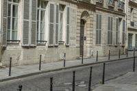 This is an image of a classic architecture building in Paris, France. The city street is lined with cobblestone road and beautiful trees. The architectural design of the building showcases a combination of traditional and urban elements. The windows and facade of the building reflect the material properties of the city. This photo captures the essence of city life in Paris and the charm of European architecture.