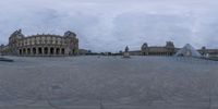A monochrome view of a city plaza in Paris, France. The straight road leads to a small building, showcasing classic architecture. The gloomy grey sky adds a touch of gloom to the urban design.