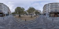 A charming cobblestone path in Paris, France, captured through a fisheye lens. Classic architecture lines the street, with historic buildings and storefronts. A perfect spot to explore and experience the vibrant city life of Paris.