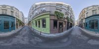 Panoramic view of a bustling street in Paris, France. Classic architecture and cobblestone alleys create an enchanting atmosphere. Colorful storefronts line the road, inviting visitors to explore shops, cafes, and restaurants. The grey sky adds a touch of gloom to the city's vibrant energy.