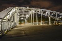 This photo captures the cityscape of Paris, France at night. The image features a large bridge with arches and street lights, illuminated against the dark sky. A man can be seen walking across the bridge, adding a sense of scale and movement. The reflection of the lights on the water creates a beautiful visual effect. This photo represents the architectural beauty and transportation infrastructure of Paris, showcasing the connection between the city and its fixed links. The combination of wood, concrete, and low lighting creates a dramatic atmosphere.