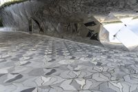 A modern architectural masterpiece in Paris, France. The limestone structure boasts futuristic design elements and a spacious urban parking deck. The concrete flooring and cobblestone road surface create a harmonious blend of city life and natural landscapes.