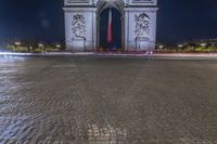 This is a nighttime image of the Arc de Triomphe in Paris, France. The iconic monument is illuminated by artificial lights, casting a warm glow on the dark city streets. In the foreground, red fire hydrants stand against the cobblestone road surface. The classic architecture and urban design of the city are captured in this photo. The Arc de Triomphe stands tall, a symbol of triumph and pride. This image showcases the beauty of Paris at night and the vibrant city life in Europe.