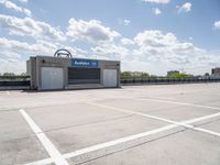 A clear sky overlooks a modern architecture parking deck in Berlin, Germany. The concrete street leads to an open space with stunning views of the city. Experience the beauty of Europe's architectural landscape.