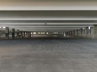 This stock photo features an empty parking garage in Los Angeles, California, USA. The concrete floors and asphalt road surface can be seen in the foreground. The building has a modern design with shades of grey. The high-rise structure is surrounded by urban design elements. The spacious hall and ceiling create an open and airy atmosphere. The garage is devoid of vehicles and offers a peaceful, quiet environment.