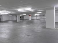 This stock photo showcases a large parking garage in Los Angeles, California, USA. The concrete building has an open space with walls, floors, and columns throughout. The well-lit interior features a spacious hall and rooms. The urban design includes a ceiling and artificial light that illuminates the parking lot surface. Perfect for illustrating urban architecture and parking deck concepts.