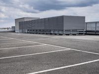 there is a long storage unit with boxes in the parking lot attached to the side of the building