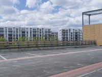A view of a modern architectural building in Berlin, Germany. The cityscape features a parking lot with concrete streets and a parking deck. The classic architecture of the surrounding buildings adds to the urban design of the area.