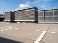 This stock photo showcases a parking lot in Berlin, the capital city of Germany. In the foreground, there is a large industrial building with striped steel fenced doors, adding a touch of urban design. The surface of the parking lot is made of concrete, which contrasts with the cobblestone road in the background. The photo was taken on a sunny day, with clouds visible in the sky. The parking lot belongs to a parking garage or parking deck, providing convenient parking for urban dwellers and visitors alike.