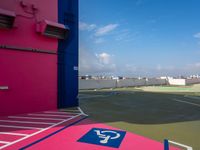 a parking area with a handicapped sign on it's side of the building next to a tall building