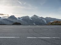 This is a clear sky dawn shot of an empty parking lot located in Austria, Europe. The asphalt road leads to a breathtaking landscape of mountains in the background. The open space and overlook provide a stunning view of nature. This packshot captures the serene atmosphere and tranquility of the break of day scene.