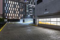 An empty parking lot in the city of Toronto, illuminated by street lights and the glow of surrounding buildings. The urban landscape is a mix of artificial light and dark shadows. A modern, sleek hotel stands in the background.