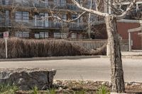 This stock photo features a parking meter situated on the side of a street in Toronto, Ontario, Canada. In the background, there is a building with bare trees and vegetation. The meter is placed next to a concrete wall and a line of trees, adding a natural touch to the urban scene. The image captures a typical day in Toronto, with a concrete street, curbs, and a driveway entry leading to the parking lot nearby. This photo perfectly represents the city atmosphere of Toronto, Ontario, Canada.