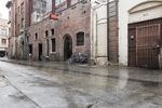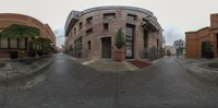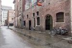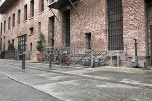Two large brown buildings in the city of Pasadena, California. Architectural structures with arched windows and brick walls. Street sign and bicycle add incidental people. A bustling day in Pasadena's retail and food industry.